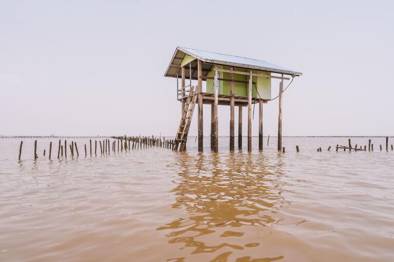 Here at this special place, the fresh water of the river mixes with the salt water of the Gulf of Thailand and thus offers the perfect conditions for the breeding of oysters and cockles. The seemingly endless expanse of the landscape is only interrupted by the traditional stilt houses in which the farmers even spend some nights.