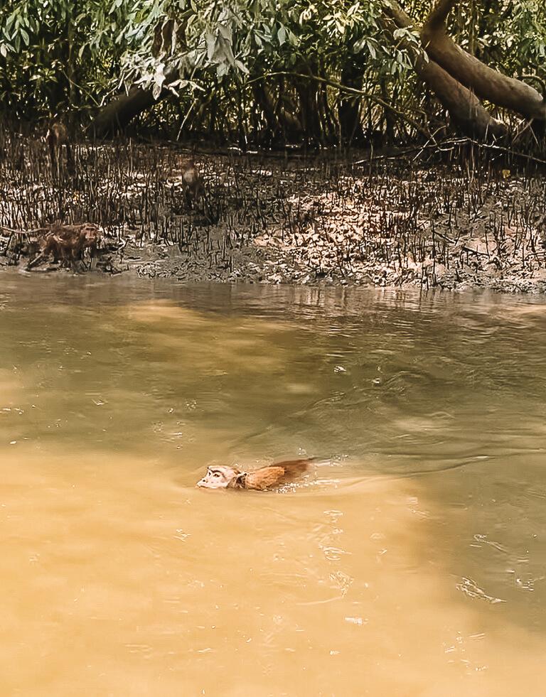 At the beginning of the trip, the animals are still sitting at the edge of the narrow channels and eyeing our boat curiously. This changes abruptly, however, when our captain starts throwing the corn cobs onto the shore and into the water. It's hard to believe, but some of the monkeys actually jump into the brown water without hesitation and even swim to our boat to receive the treats personally. Absolutely crazy!
