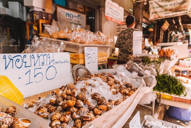 The Don Wai Floating Market is still so unknown to tourists that I hardly encountered any others during my visit. Nevertheless, it was crowded on this sunny Sunday at the lively market, because at the weekend there is apparently nothing better for the inhabitants of Bangkok than to go out to the more rural areas and really celebrate the theme of food. And where better to do that than at a traditional market, where all the delicacies that the fields, the land, the rivers and the seas offer are presented in all imaginable variations, in an exuberant abundance!