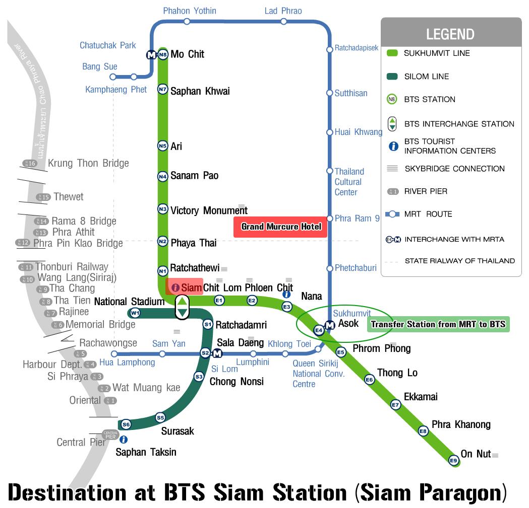 The aerial metro or Skytrain is called the BTS(Bangkok Mass Transit System ). There are 2 Skytrain lines in Bangkok: the Sukhumvit line and the Silom line. They have been in service since 1999. The lines run along the capital's main roads, covering a total distance of 26 km and 25 stations, one of which connects with the MRT underground metro. Automatic ticket machines are available at all stations to buy tickets or day passes.